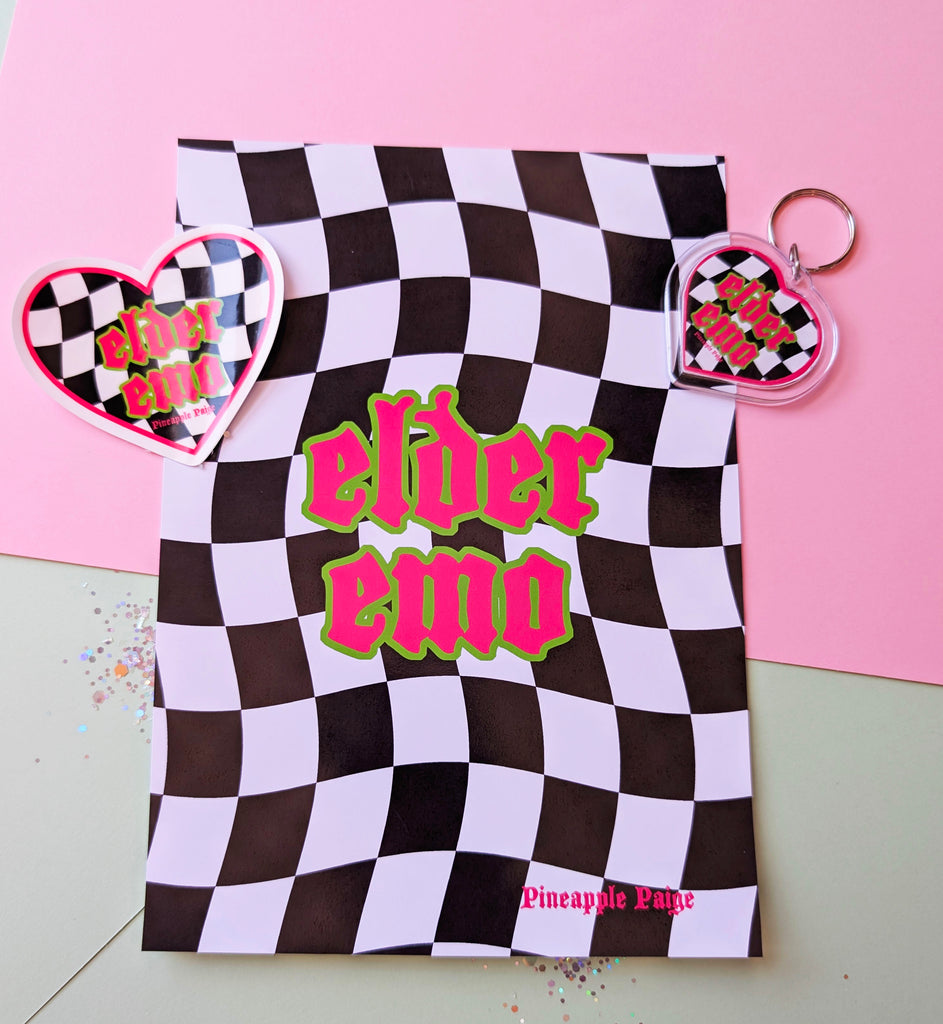 Show off your elder emo pride wherever you go with this love heart-shaped keychain! Featuring a bold black-and-white checkerboard design and the iconic "Elder Emo" text, this keychain is the perfect nod to your Warped Tour days (and your refusal to let go of them).
