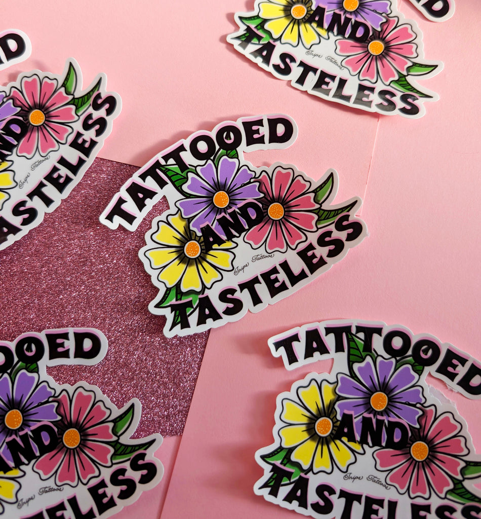 For the babes who are proudly a little loud and a little tasteless 🌹💀. This tattoo-style floral sticker is equal parts cute and sassy, and perfect for decorating your water bottle, laptop, or sketchbook.